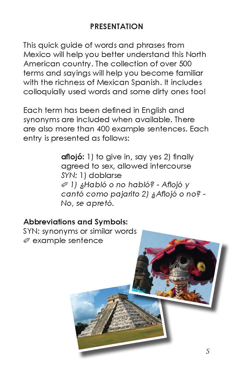 This dictionary-style PDF ebook of words and phrases helps you better understand Mexican Spanish and slang. The collection of more than 450 terms and sayings will help you become familiar with the richness of the country’s Spanish. It includes slang and naughty words that you will likely run across in everyday conversations.