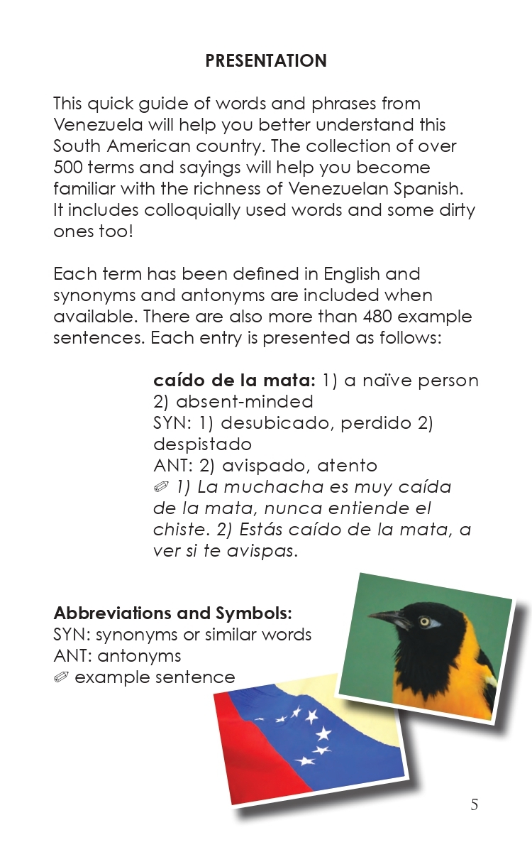 This dictionary-style PDF ebook of words and phrases helps you better understand Venezuelan Spanish and slang. The collection of more than 500 terms and sayings will help you become familiar with the richness of the country’s Spanish. It includes slang and naughty words that you will likely run across in everyday conversations.