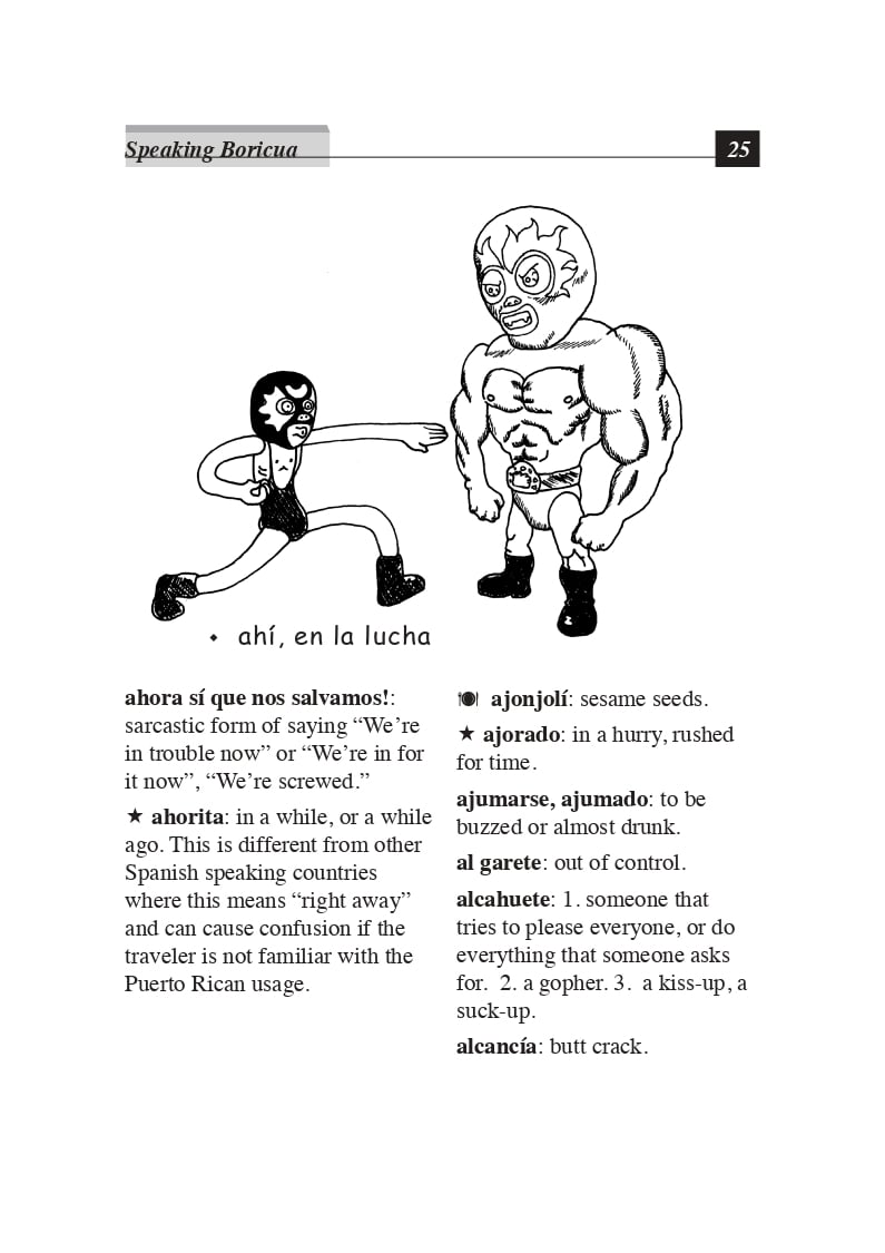 This best-selling Puerto Rican Spanish book, Speaking Boricua, is a humorous guide to Puerto Rican Spanish vocabulary. With over 1,500 Puerto Rican words and phrases, you will quickly understand Puerto Rican vocabulary and slang.